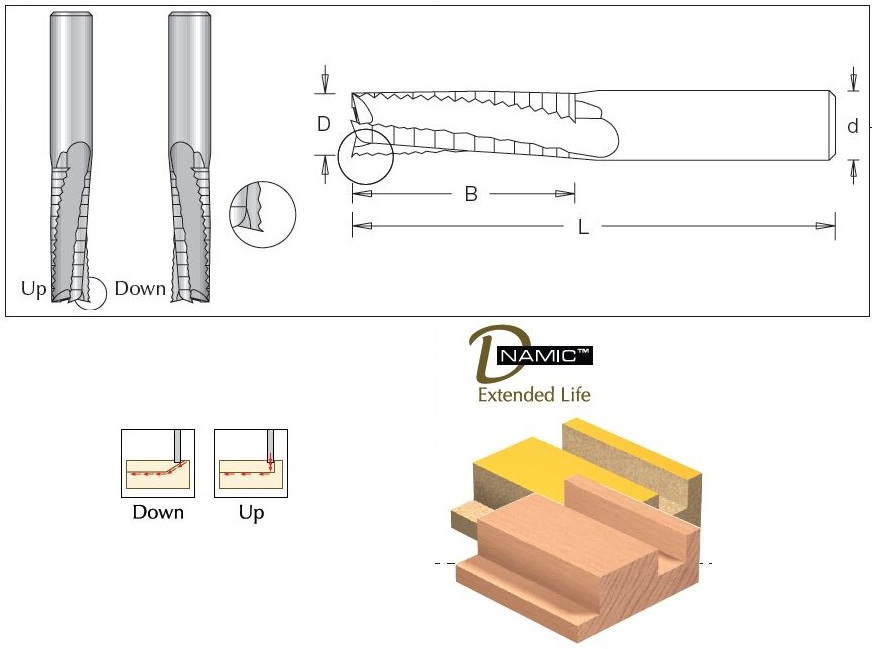 Solid tungsten carbide router cutter complete with three spiral flutes. Suitable for ‘roughing’ cuts in softwood, hardwood and man made board (with or without coating). Carbide for maximum durability in abrasive materials. Upcut spiral for optimum chip flow and improved finish on the bottom of the board. Downcut for better clamping when machining small work pieces and improved finish on the top of the board. For use on routers and machining centres with or without CNC control.